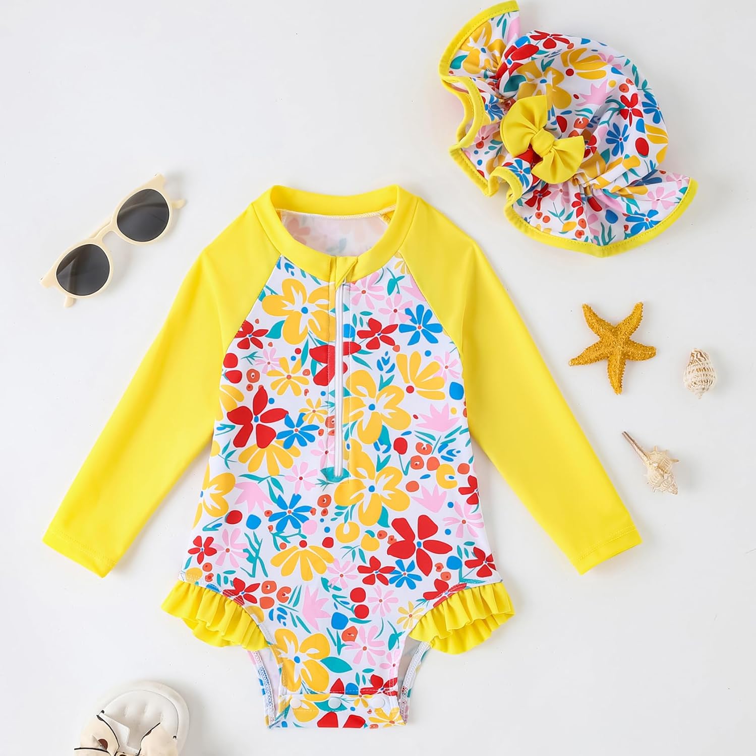 Baby Girl Swimsuit One-Piece Long Sleeve Rash Guard with Hat Set Strawberry/Flower Zipper Bathing Suit