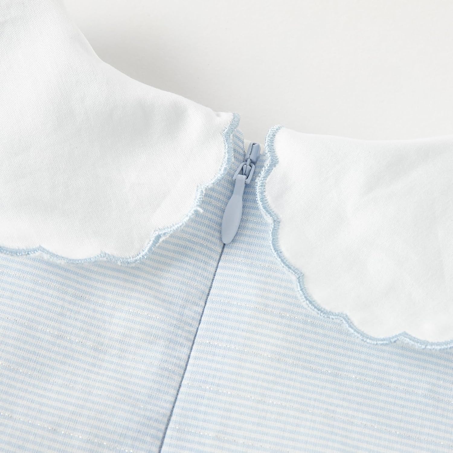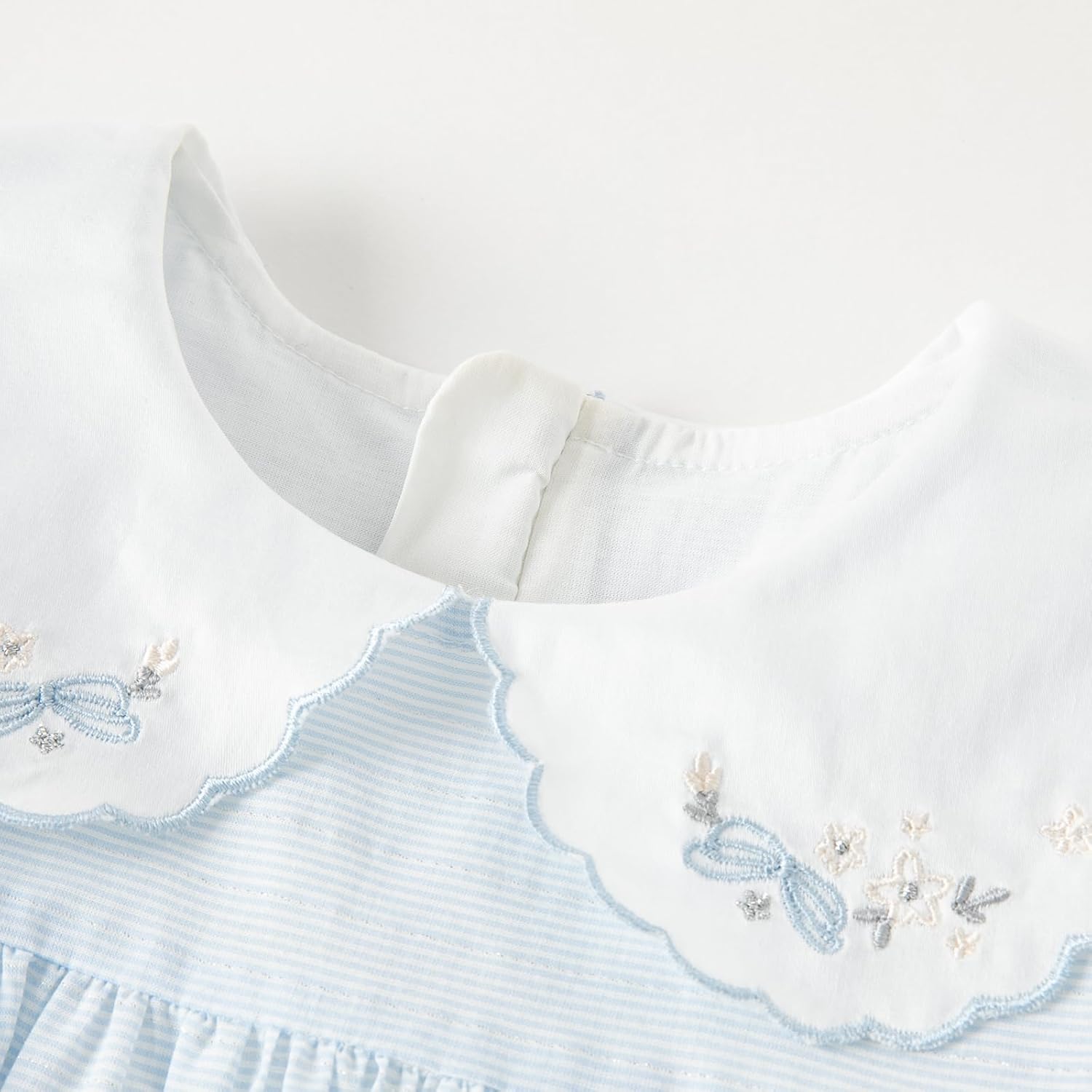 DAVE&BELLA Toddler Baby Girls Summer Dress, Short Puff Sleeve Cotton Sundress Blue Striped Flower Embroidery Prince Dresses
