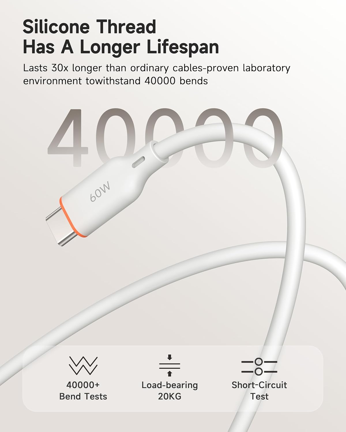 Premium Soft Silicone Material: Unlike stiff nylon cables, our ultra-flexible silicone cable- resists tangles, cracks, and fraying—gentler on devices and and this Type C to Lightning cable is perfect for home, travel, or car use