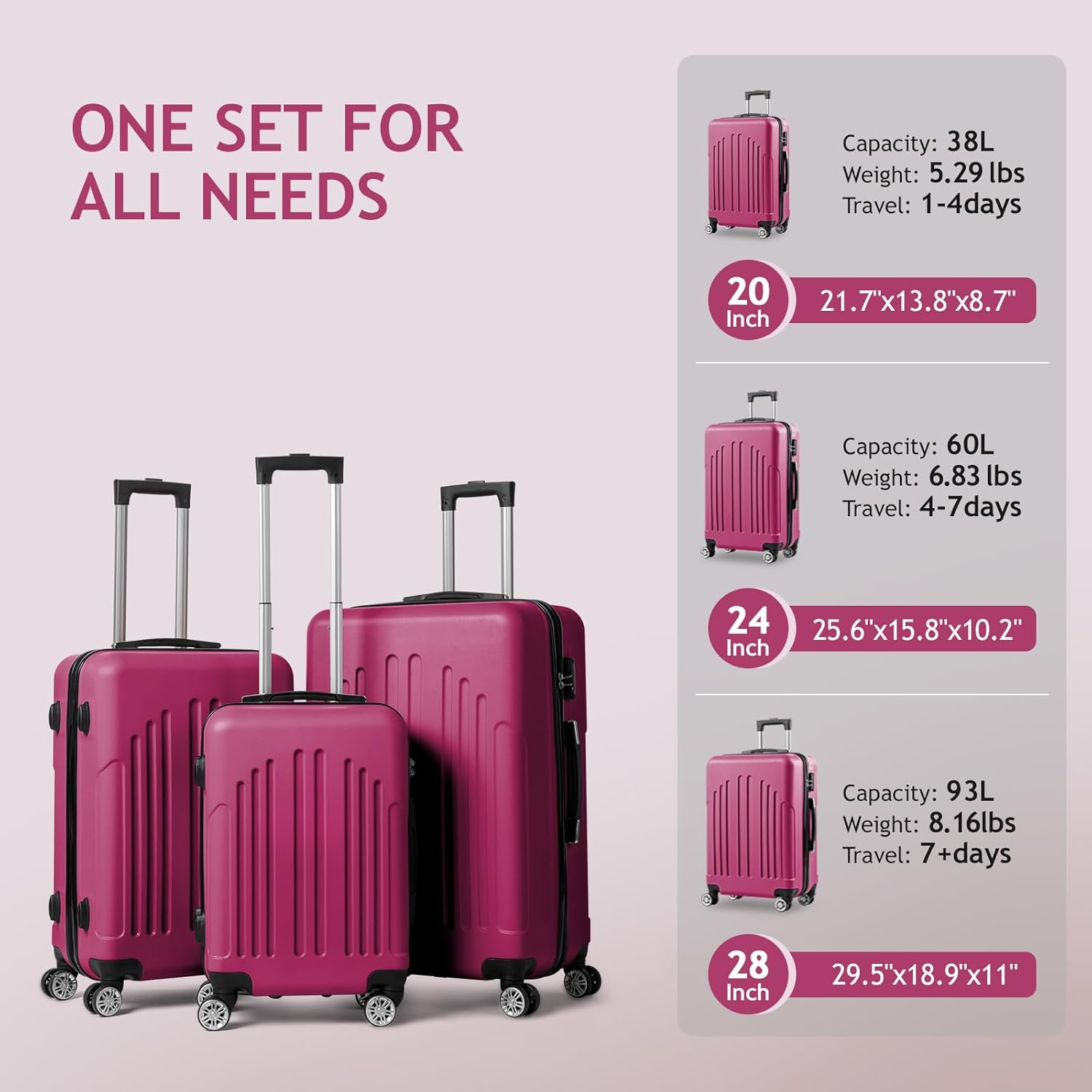 【Demision】Here are the dimensions for each size of the luggage set: – 20 inch: 21.7″ x 13.8″ x 8.7″, 38L, 5.29lbs, for 1-4 days travel – 24 inch: 25.6″ x 15.8″ x 10.2″, 60L, 6.83lbs, for 4-7 days travel – 28 inch: 29.5″ x 18.9″ x 11″, 93L, 8.16lbs, for 7+ days travel