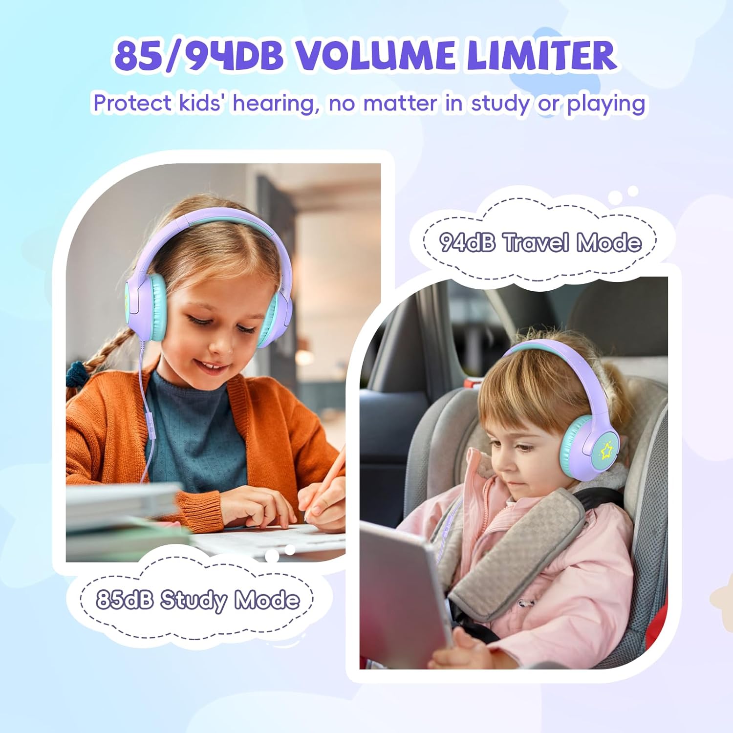 【Safe & Clear Listening】85dB/94dB volume-limiting of these kids headphones is adjustable for different environments(85dB for study mode, 94dB for travel mode), ensures safe listening levels, protecting children’s sensitive ears during daily use and preventing long-term hearing damage