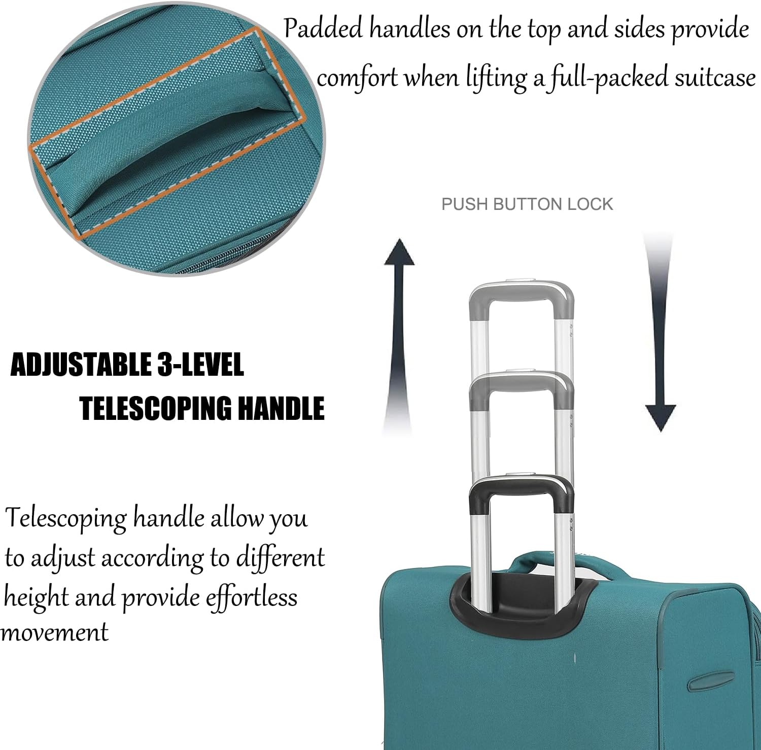 【Ergonomic 3-Step Durable Iron Handle】: The button-type multi-level handle can be adjusted to different heights, locking handles provides easy maneuverability when extended out from the suitcase, and stores neatly inside when not in use; Reinforece Padded lift handles located on the top and size provide comfort when lifting and carrying of luggage.