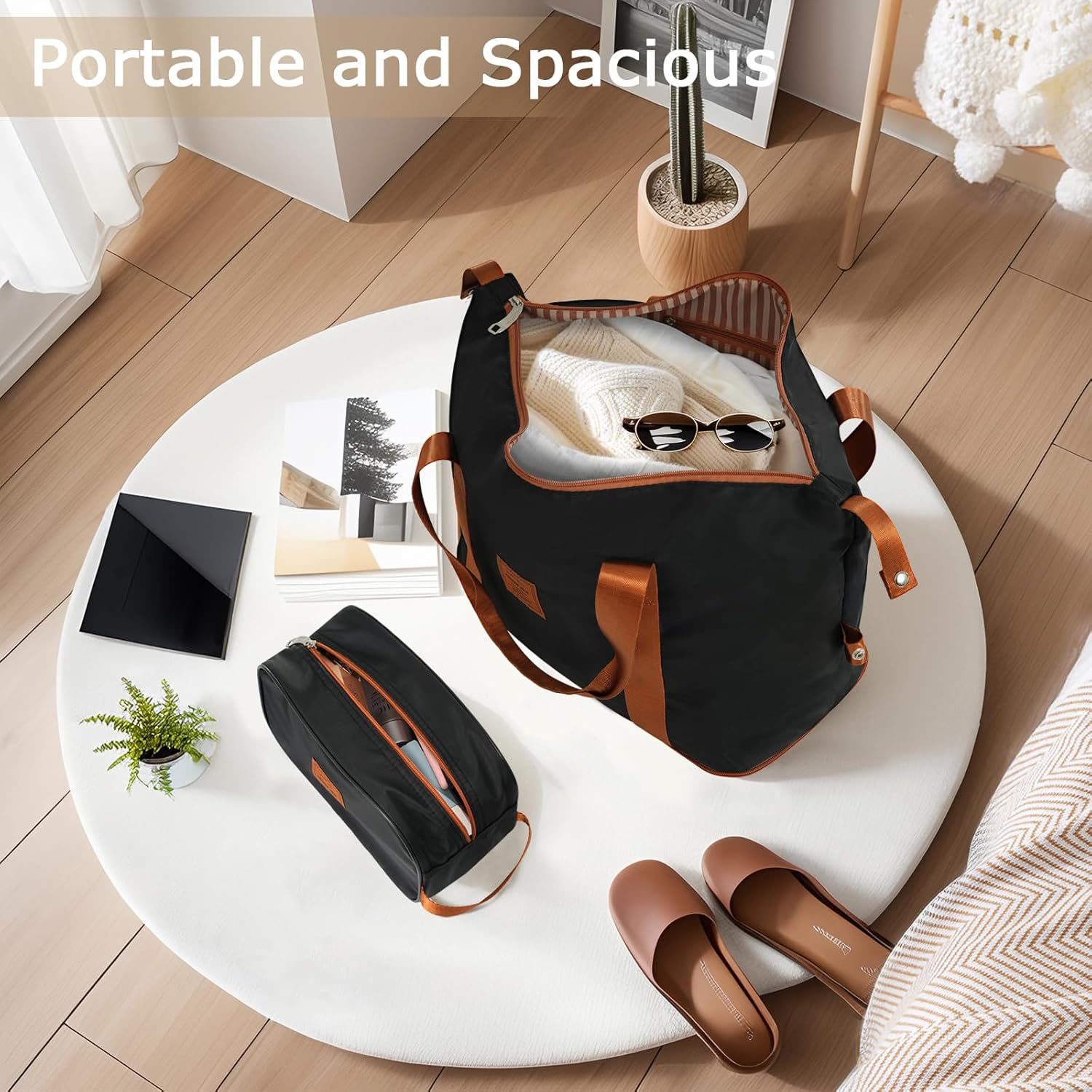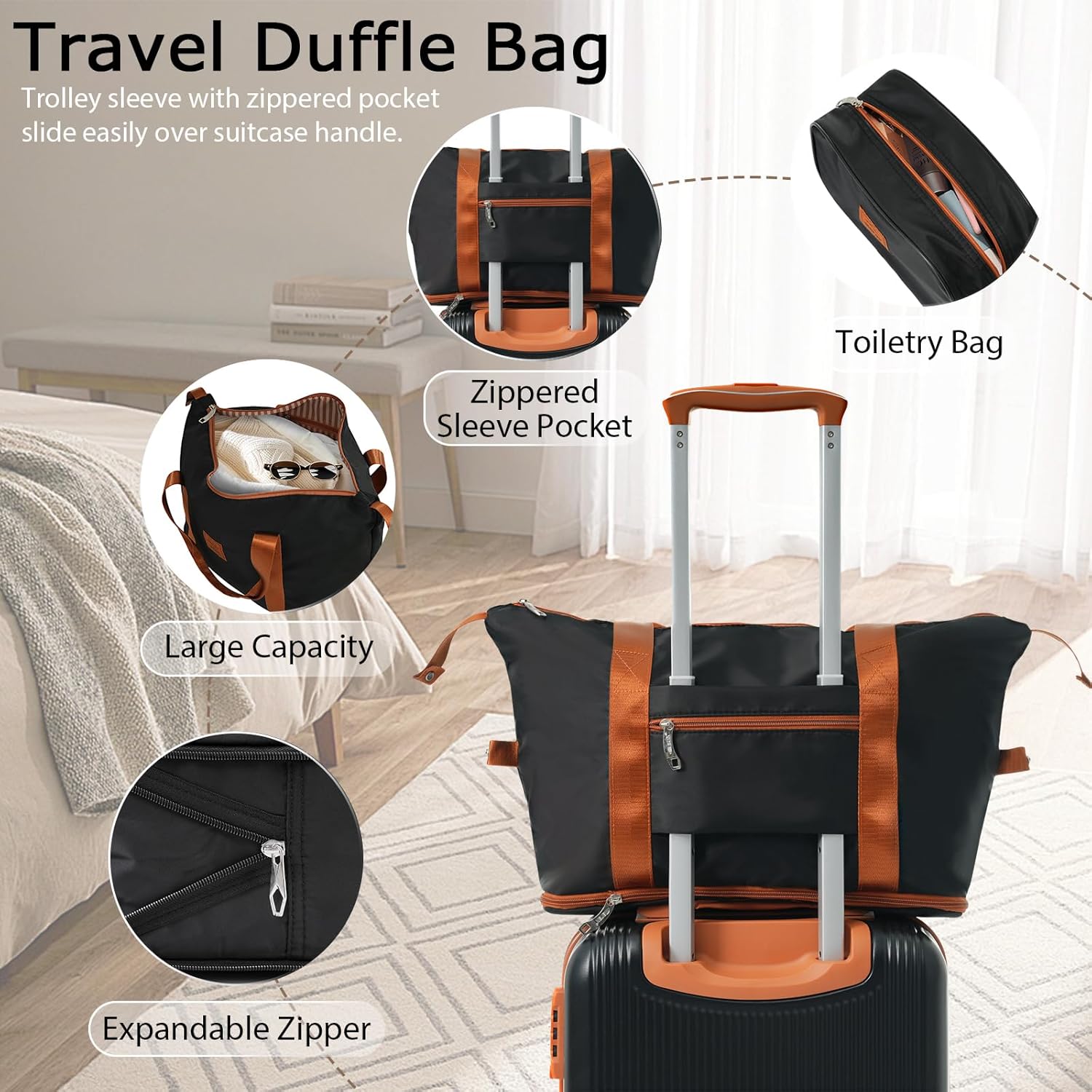【Expandable Duffel Bag】longest length: 21.7″, shortest length: 15.7″, width: 8.3″, height: 13″, expanded height: 17.7″. Travel duffel bag features a trolley sleeve with a zippered pocket that easily slides over the luggage handle. Weekender bag can be expanded to hold more items. Perfect travel bag, gym bag.