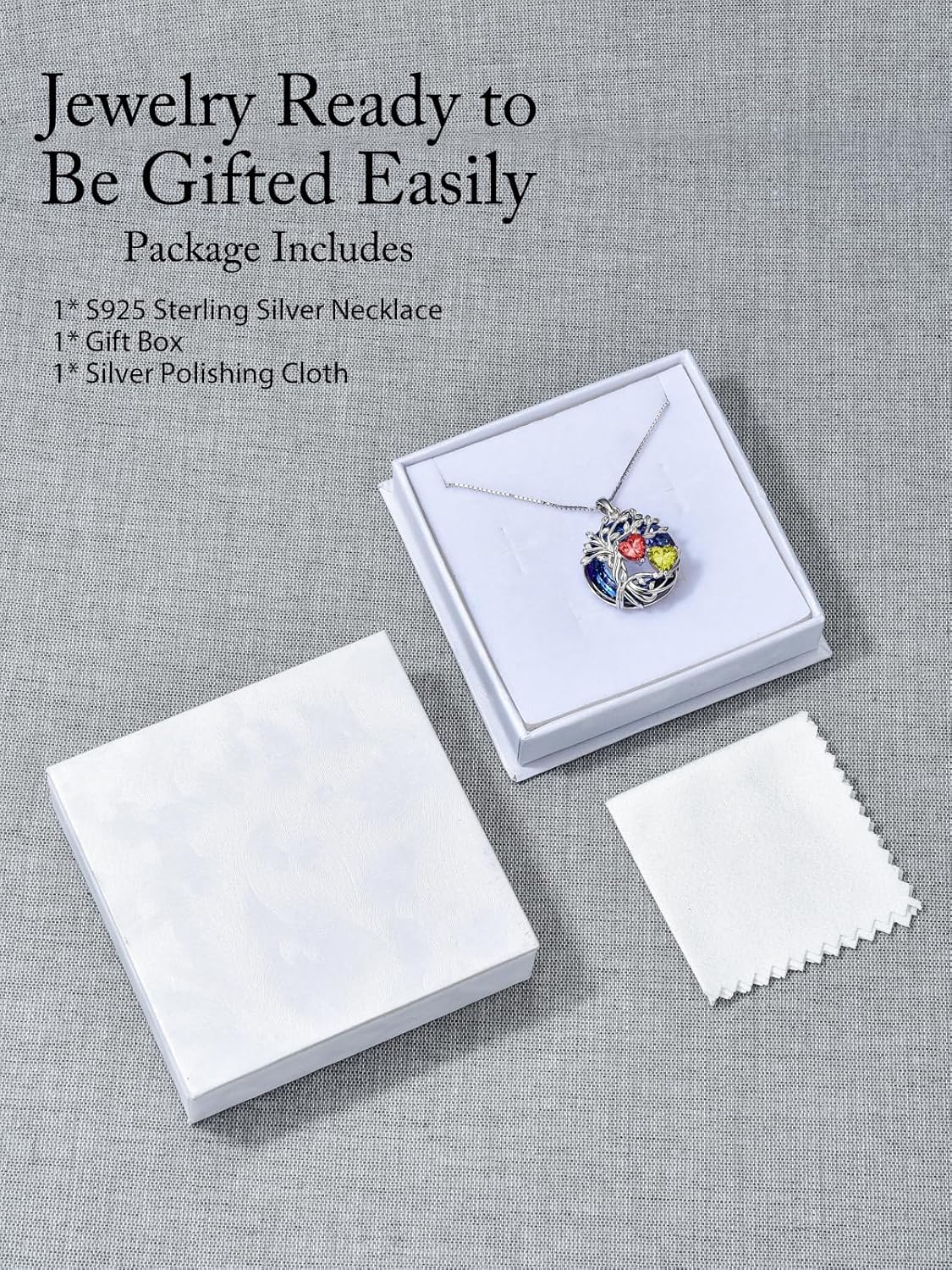 The package includes a tree of life birthstone pendant necklace, a beautifully crafted gift box, a greeting card, and a silver polishing cloth. It is ready to be given as a gift to your girlfriend, or any other woman you deeply care for.