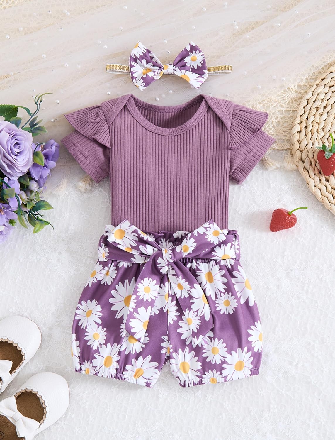 Newborn Girl Clothes Ruffled Sleeveless Romper Top Cute Floral Shorts with Headband Baby Girl Summer Clothes
