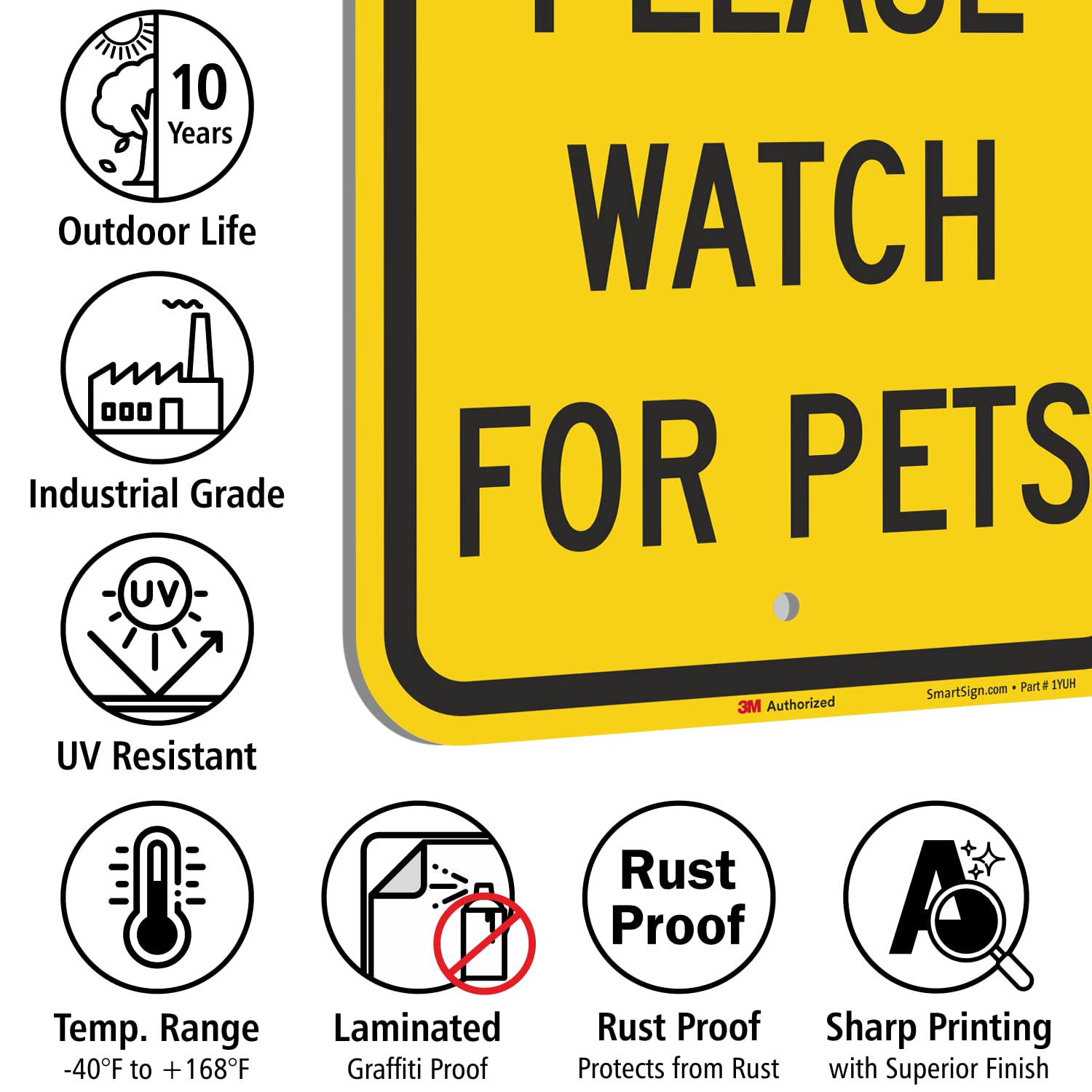 DURABLE ALUMINUM: ‘Please Watch For Pets’ signs are made of 63 mil thick heavy-duty rustproof reflective aluminum that easily lasts 10 years outside and meets DOT road and traffic requirements.