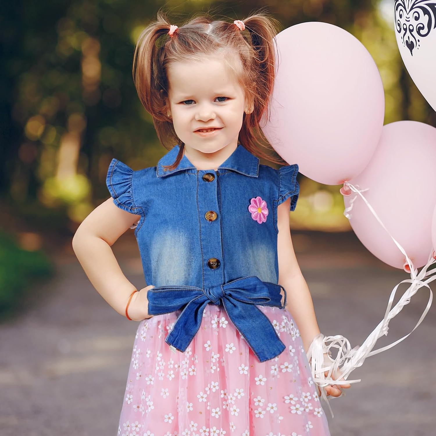 Design:Denim tulle toddler girl dresses with Bowknot waist belt; The tutu skirt features a floral pattern.