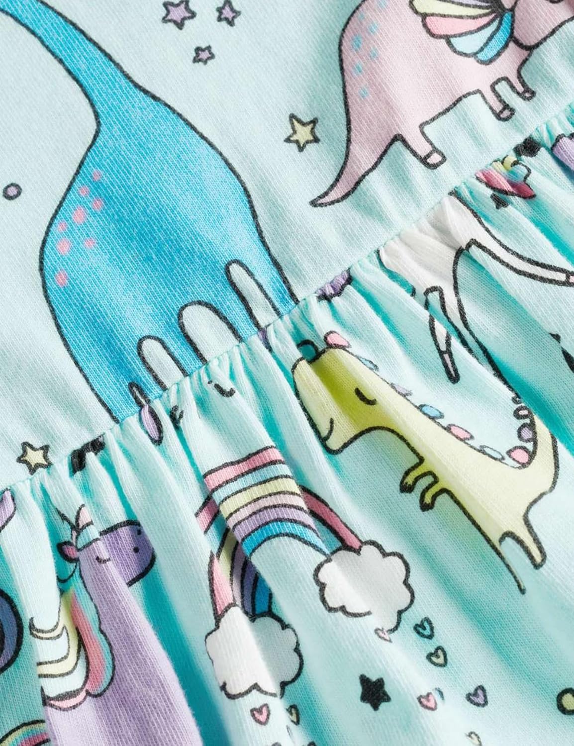 Customers love the dress’s cute dinosaur and unicorn pattern, soft material, and find it perfect for 4-year-olds. The dress works well as a night gown and customers consider it well worth the money. The fit and material quality receive mixed feedback – while some say it runs true to size, others note it’s larger than stated, and while some praise the cotton material, others find it painfully thin.