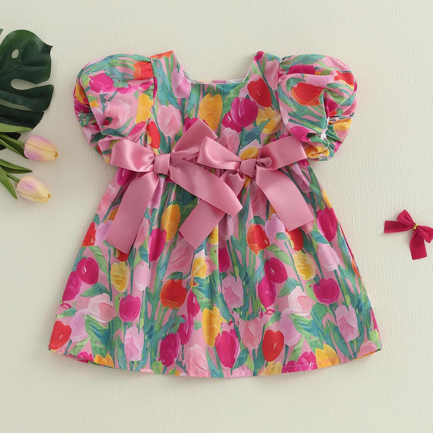 Baby Girl Floral Dress Short Sleeve Square Neck Bow Front Floral Print Loose Dress Toddler Casual Dress